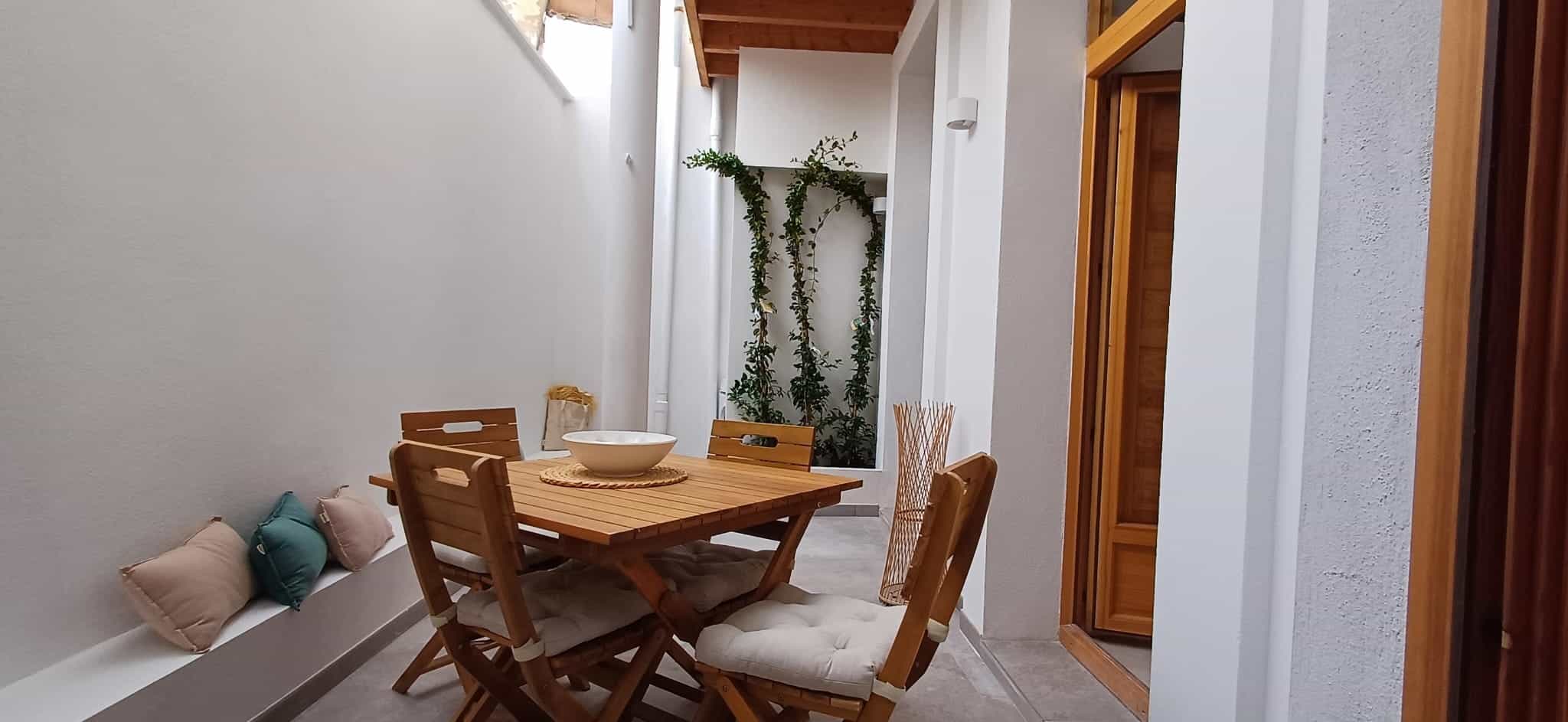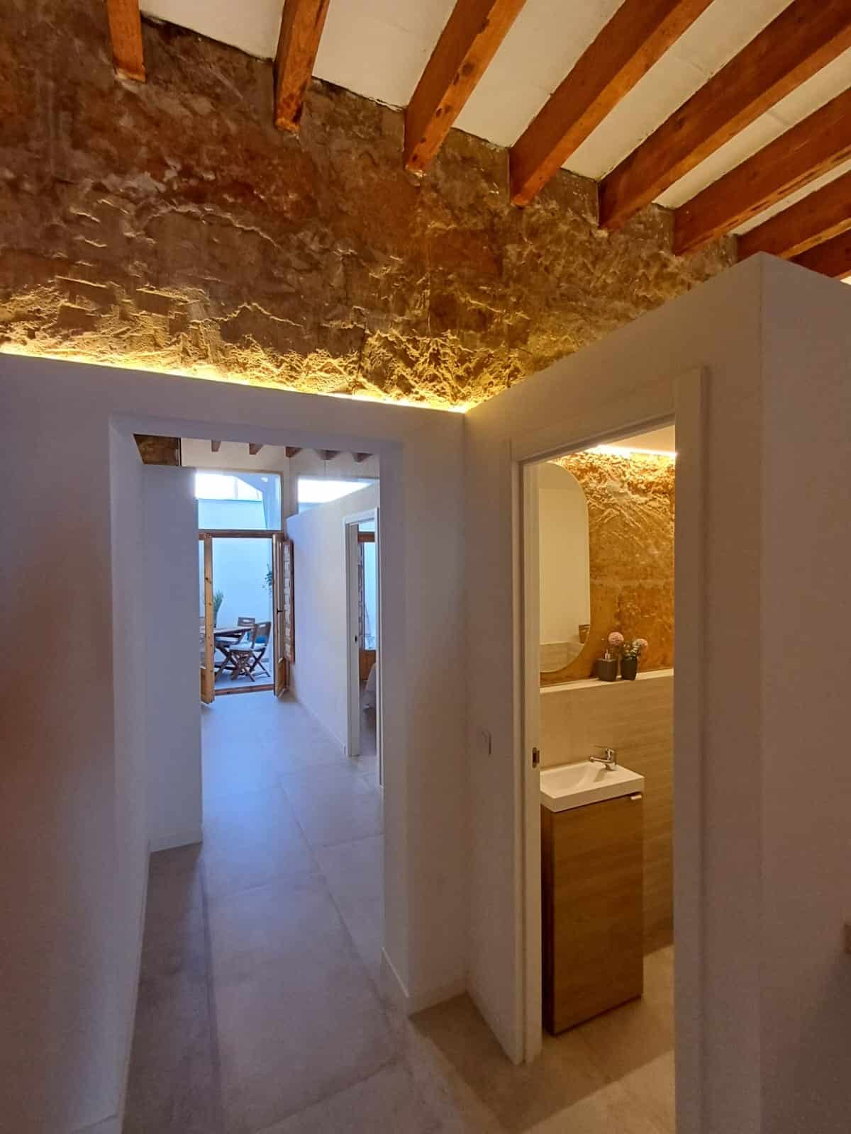 High ceilings, original woodwork, large living room and dining room, two main suites bedrooms with private bathroom and a third bathroom of service. Modern kitchen fully equipped. Courtyard/patio of about 12m2. Keeping the rustic-Mallorquin style, we have mixed a modern and minimalist style that enhances its original characteristics, as for the exposed wooden beams and the mares stone walls that identify island. These elements finally used in a review idea for this simple and characterizing apartment give uniqueness to the object itself.